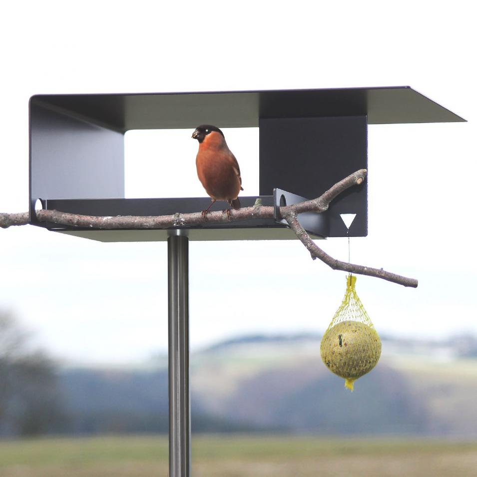 Klare Formen, geradlinige Kanten prägen dieses Vogelhaus im Bauhausstil. Ein weit überspannendes Flachdach schützt das Futter ausreichend vor Regen und Schnee. Als Landehilfe dient ein einsteckbarer Ast.