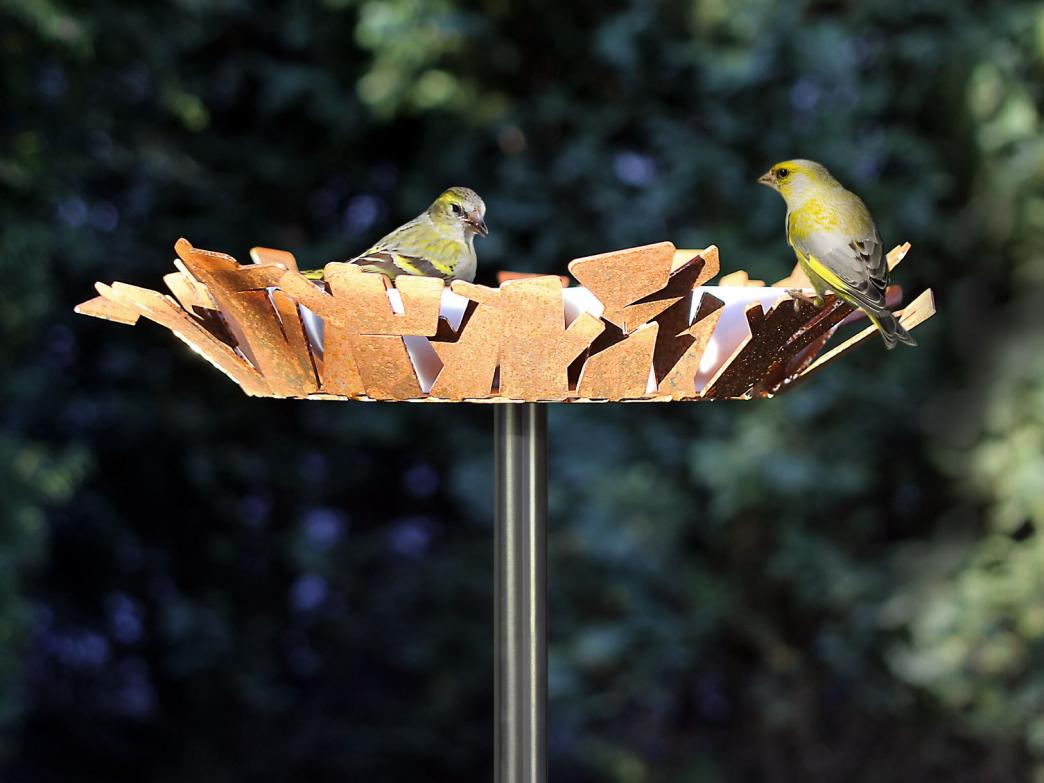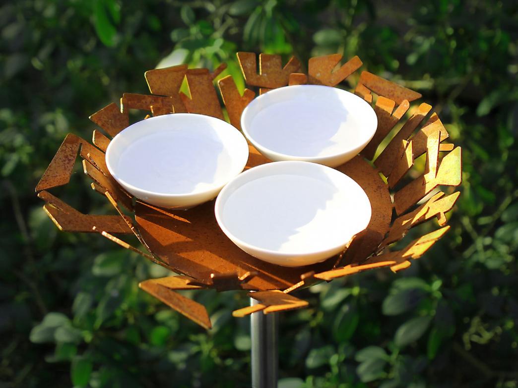 Ein Nest aus Edelrost (Corten-Stahl, leicht vorgerostet) als Vogelimbiss