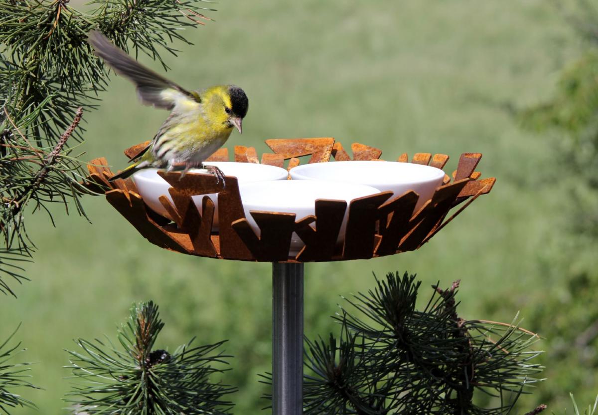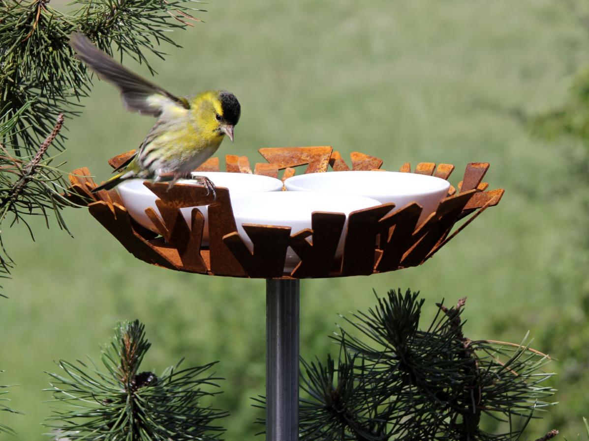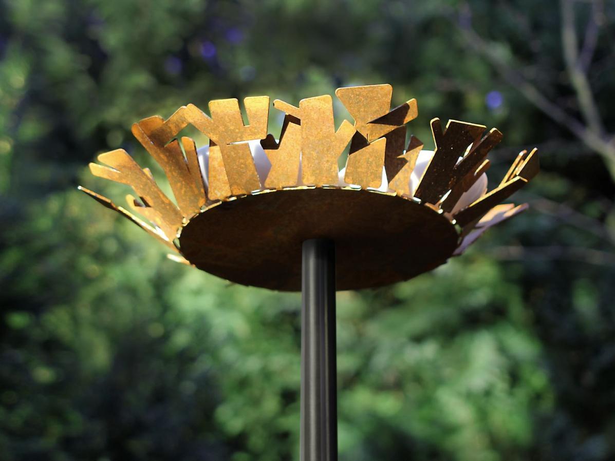 Unsere Vogeltränke VT-2 in Edelrost. Dieser spezielle Cortenstahl bildet eine wetterfeste Schutzschicht aus Edelrost aus, die zudem ein Weiterrosten unterbindet.