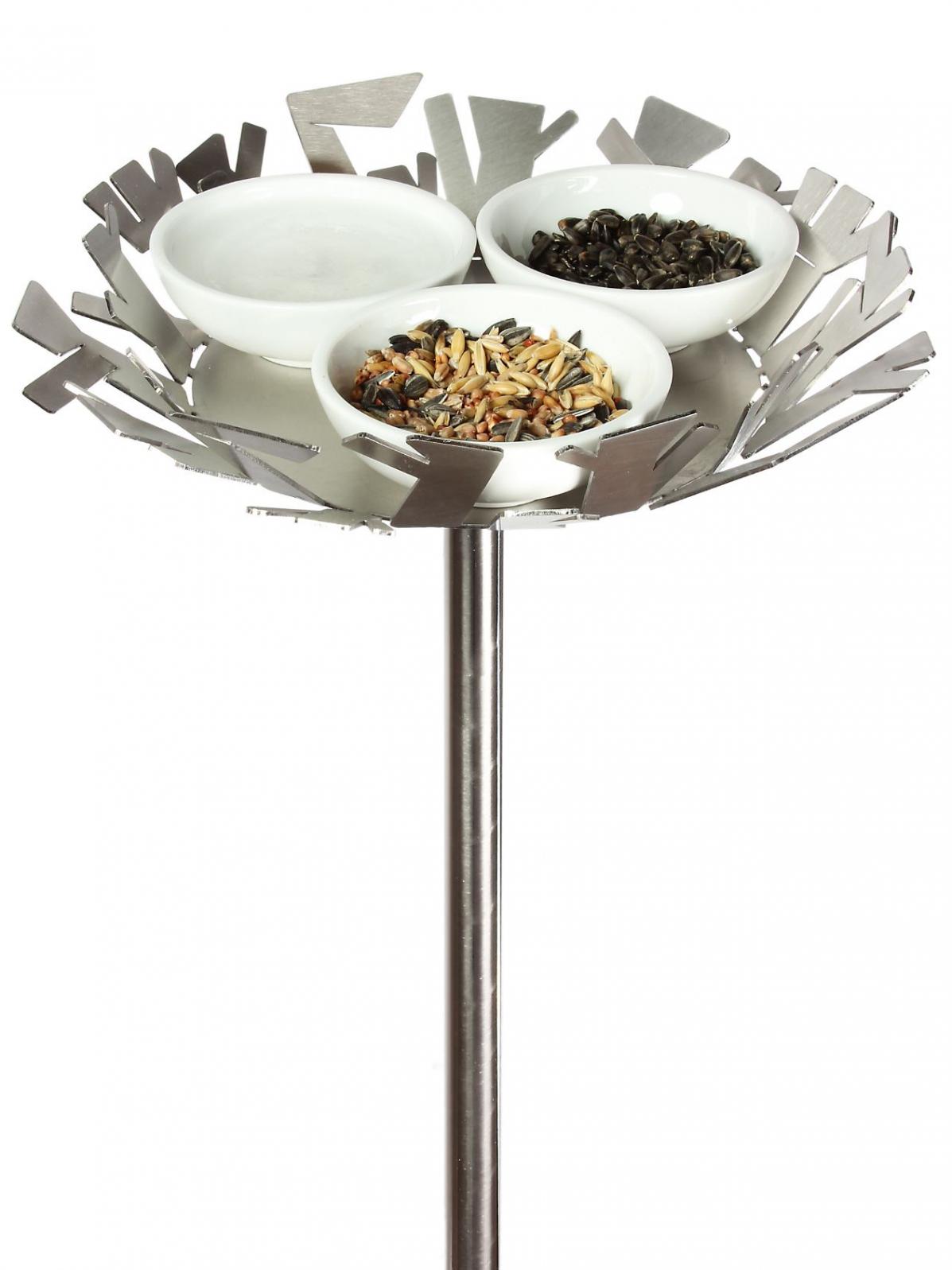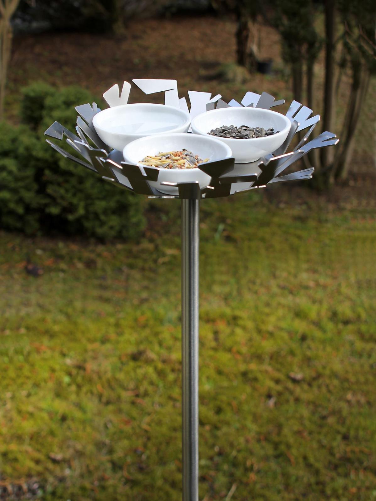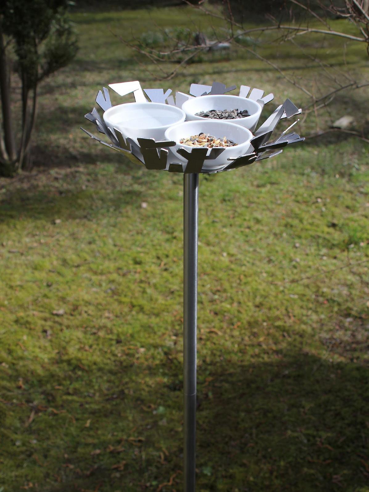 Was liegt näher, als eine Vogeltränke in Nestform zu gestalten. Wir haben ein Vogelnest mit modernen Materialien interpretiert. Wahlweise in 2 Varianten erhältlich: aus Edelstahl oder aus Cortenstahl, jeweils mit 3 Porzellanschalen