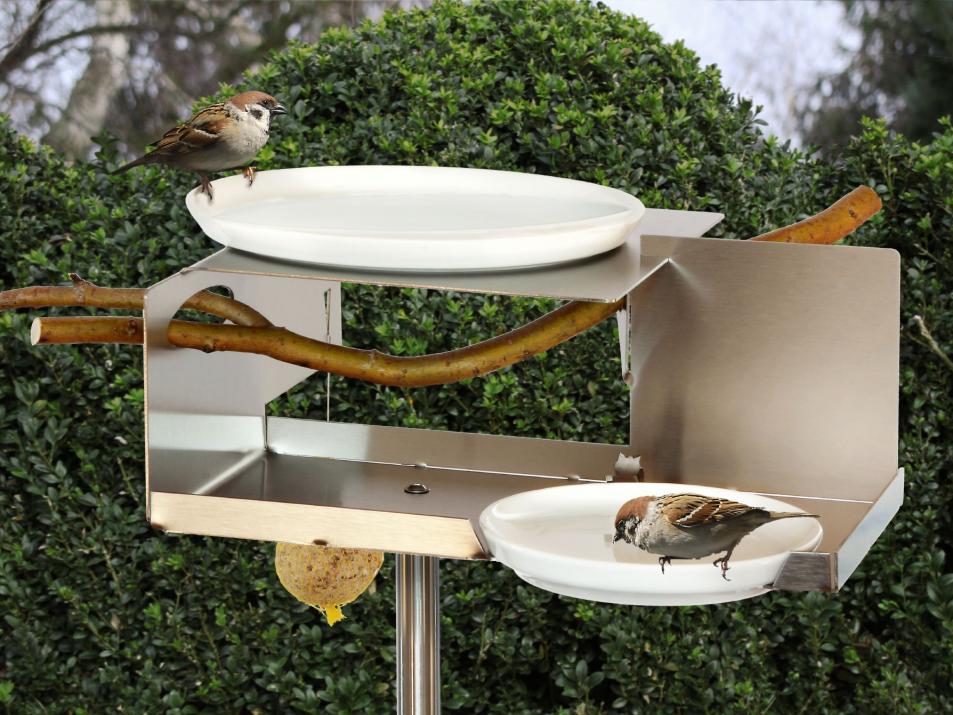 Unsere Vogeltränke VT-1 hier in einer Edelstahlausführung. Statt pulverbeschichtetem Aluminium verwenden wir gebürdtetes Edelstahl